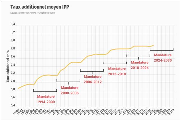 Chaque année, le Ministre des Pouvoirs locaux émet toutefois une circulaire budgétaire reprenant notamment, pour l’ensemble des taxes locales et additionnelles, des recommandations sur les taux maximums auxquels les communes devraient se conformer afin de limiter la pression fiscale sur les contribuables et sur les entreprises. Ces recommandations sont, par définition, non contraignantes. La recommandation en matière de taux maximum pour les additionnels à l’IPP s’élevait à 8,8 % en 2025. Même si cette recommandation a été respectée, force est de constater qu’il existe de fortes disparités parmi les communes.